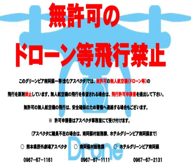熊本県野外劇場のアスペクタやホテルグリーンピア南阿蘇一帯は、固有のドローン規制が敷かれています。