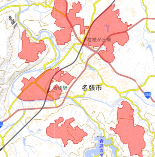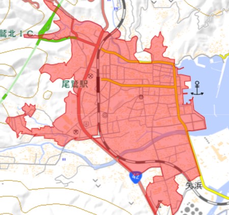 地図上の赤い色に覆われてる部分が「did=人口集中地区」です。