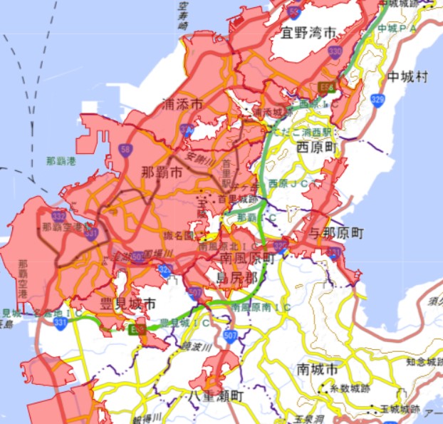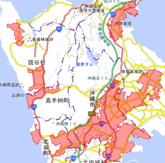沖縄市・うるま市・北台町・嘉手納町・読谷村各中心部、那覇市・糸満市・宜野湾市・浦添市・中城村・西原町・与那原町・南風原町・豊見城市・八重瀬町各中心部