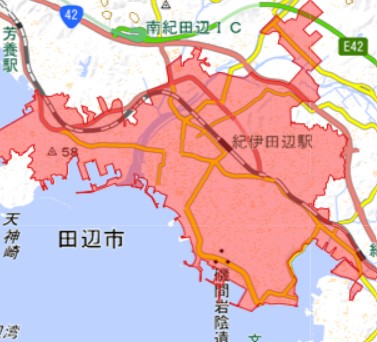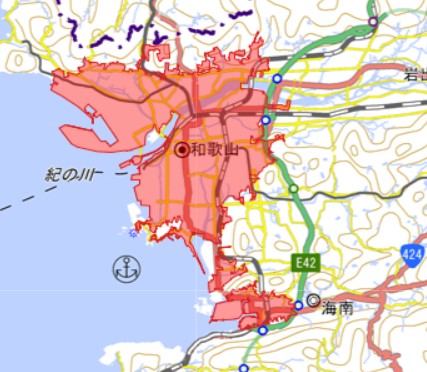 和歌山市・海南市中心部、有田市中心部、湯浅町中心部、御坊市中心部、田辺市中心部、新宮市中心部