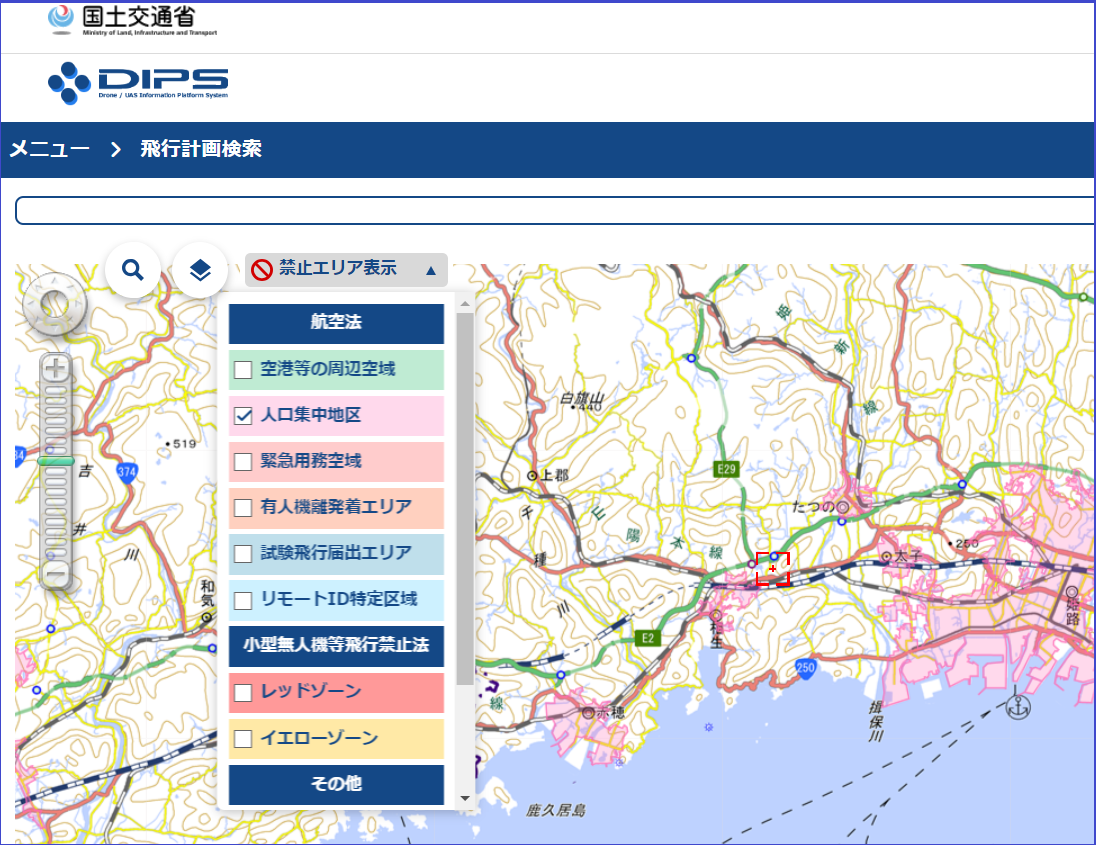国土地理院の地図の他にもう一つ、その土地がDID地区かどうかを調べるのに手っ取り早いのは「ドローンフライトナビ」といわれるアプリです。