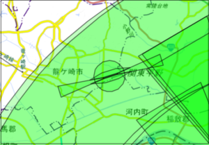 中央の左右に伸びるのが竜ケ崎飛行場の規制空域です。