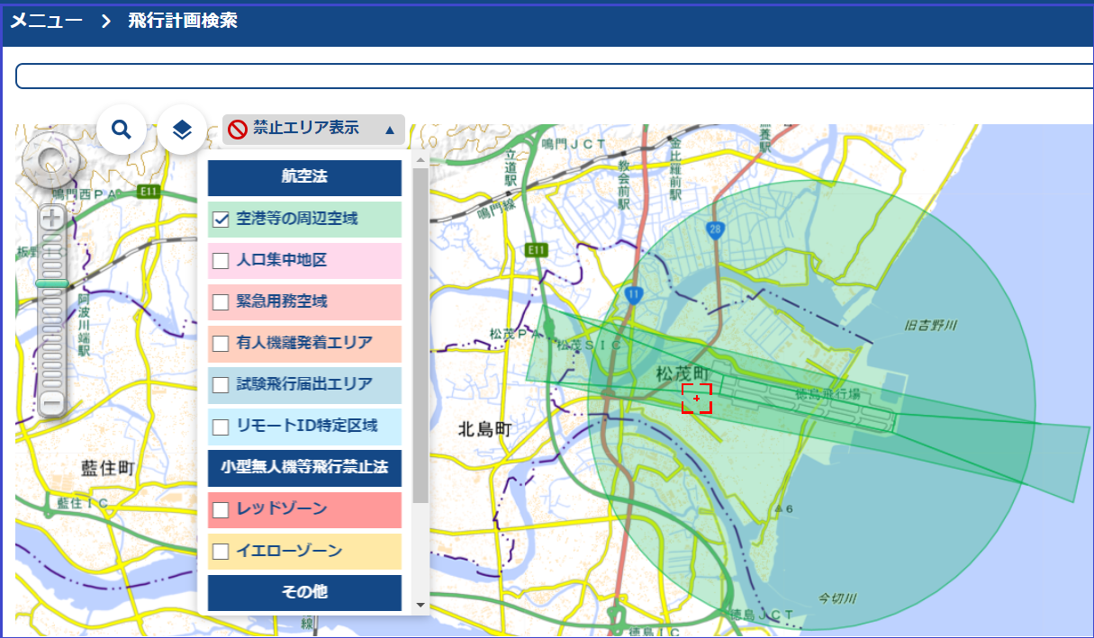 この中に「飛行計画の通報」というメニューがあり、ここで「飛行計画の参照」を選ぶと以下のような画面が現われ、左側にあるメニューバーから人口集中地区を選べば確認できます。